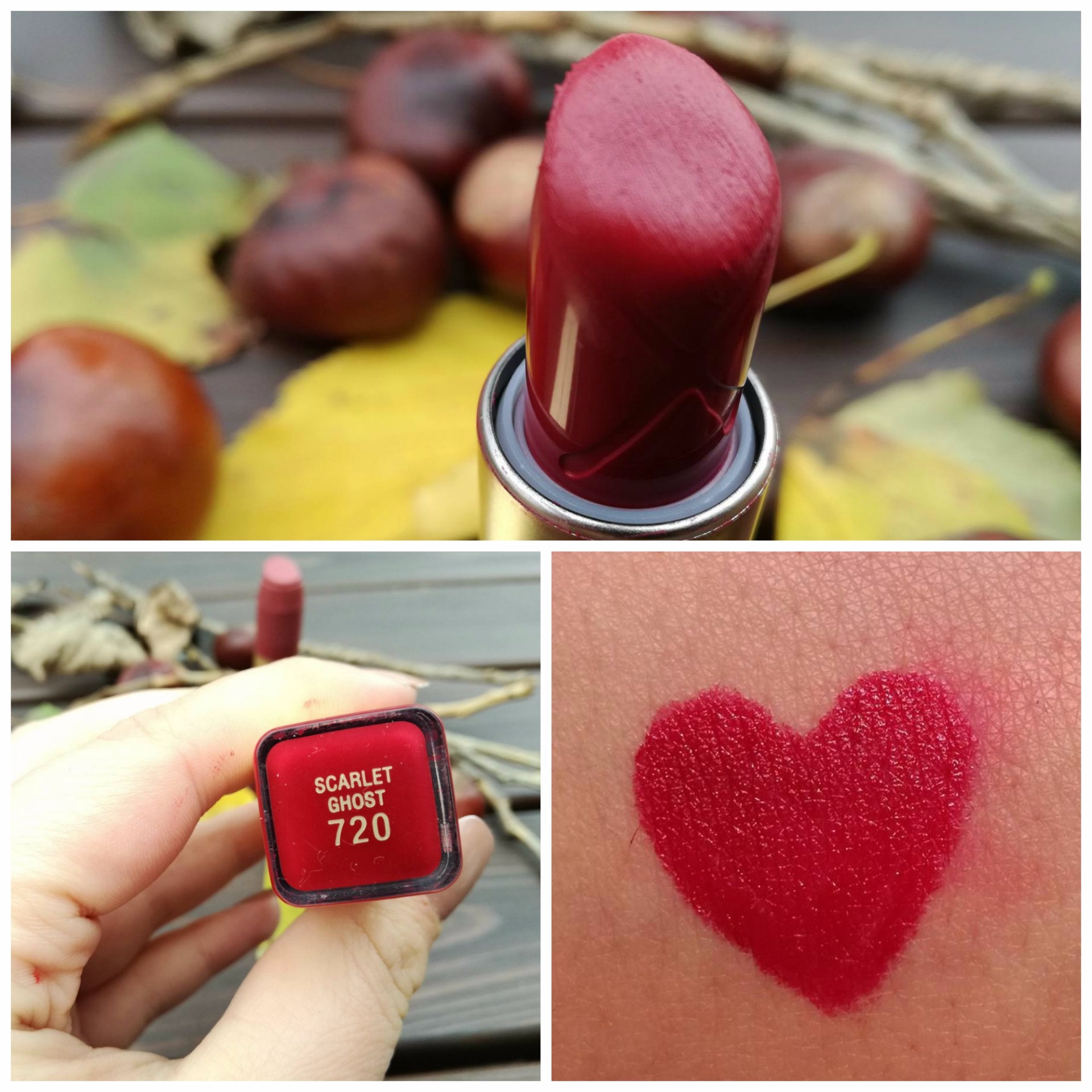 Na jeseň rozhodne nesmie chýbať klasický vínový odtieň rúžu. Môj obľúbený je od značky Max Factor v odtieni 720. Je to pomerne hydratačný rúž, no aj napriek tomu drží pomerne dobre. Na perách vydrží celý deň, samozrejme s malými úpravami počas dňa .