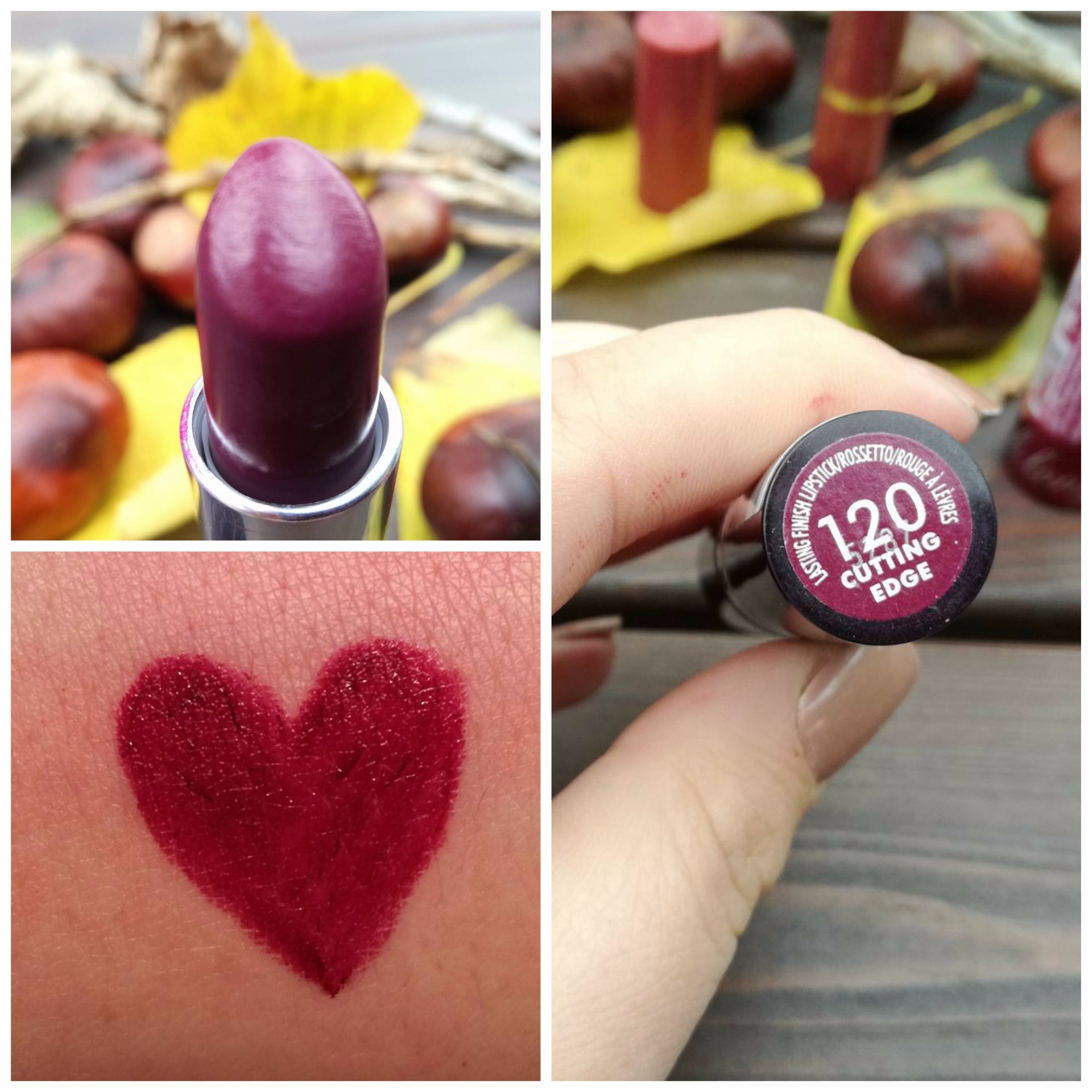 Absolútna topka na jeseň je rúž od značky Rimmel London v odtieni 120. Na fotke sa tvári ako vínová, no vínová to naozaj nieje. Jeho farba sa veľmi ťažko popisuje, ale je to niečo ako vínová s kvapkou fialovej. Výsledný efekt na perách je polomatný. Jediný problém je, že bez kontúrky sa mi za hodinku rozpije okolo pier.